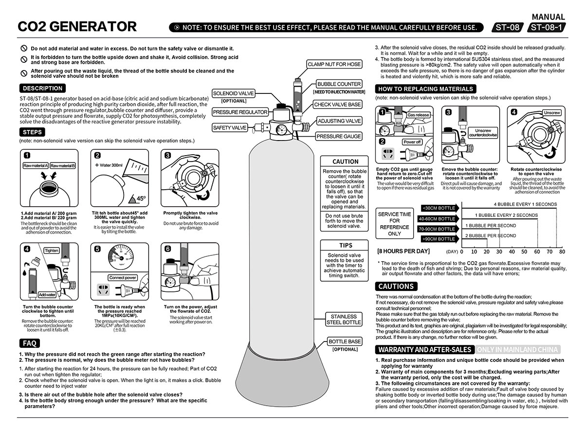 Het compacte ontwerp van het apparaat zorgt voor een eenvoudige installatie in aquaria van verschillende groottes zonder al te veel ruimte in beslag te nemen. Gebruikers volgen eenvoudigweg de instructies om het reactieproces eenvoudig te starten door de grondstoffen toe te voegen, wat een eenvoudige bediening en weinig onderhoud garandeert. Dankzij de stabiele uitgangsdruk kunnen gebruikers de CO2-afgiftesnelheid duidelijk controleren met behulp van de bellenteller, waardoor een betere aanpassing van de toevoer mogelijk is om een evenwichtige en stabiele aquariumomgeving te behouden.